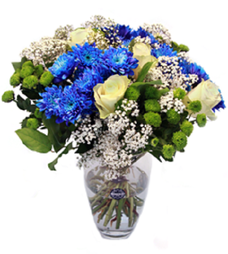 Um bouquet criado com Rosas, Euro Pintado Azul, Yoko Ono, outras flores e folhagem.