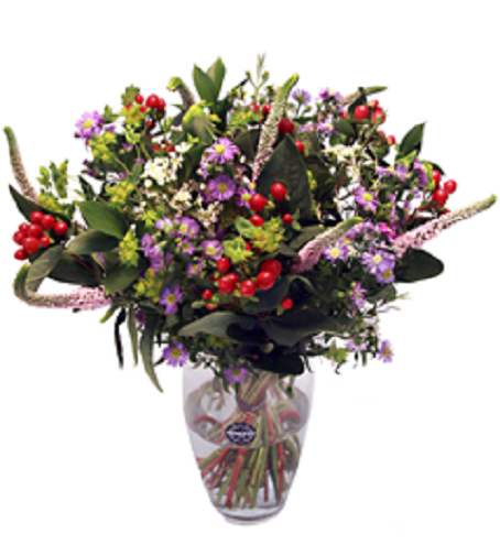 Um bouquet de flores composto por Aster, Verónica, Wax, outras flores e folhagem.