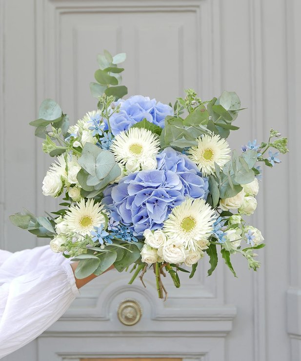 Bouquet em tons de azul verde e branco.